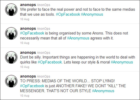 Ένας εκ των επικεφαλής των Anonymous έσπευσε να διαψεύσει μέσω twitter την φερόμενη επίθεση της οργάνωσης στο facebook.